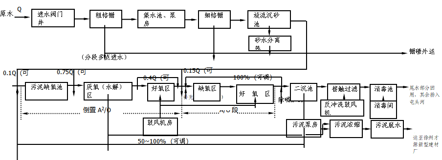 該污水處理廠處理工藝采用倒置A2/O+A/O生物脫氮除磷工藝,末端采用接觸過(guò)濾工藝作為補(bǔ)充凈化處理工藝,污泥處理采用帶式濃縮脫水一體機(jī)。處理后的尾水經(jīng)二氧化氯消毒后排入屯頭河。工藝處理流程為: